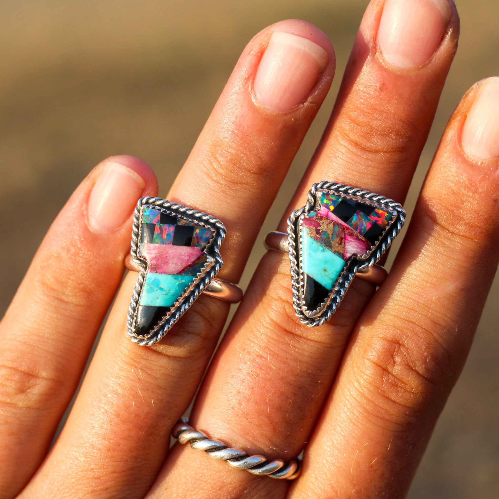 Opal, Pink Spiny Oyster, Turquoise & Black Onyx lightning bolt ring with twisted wire detailing.
